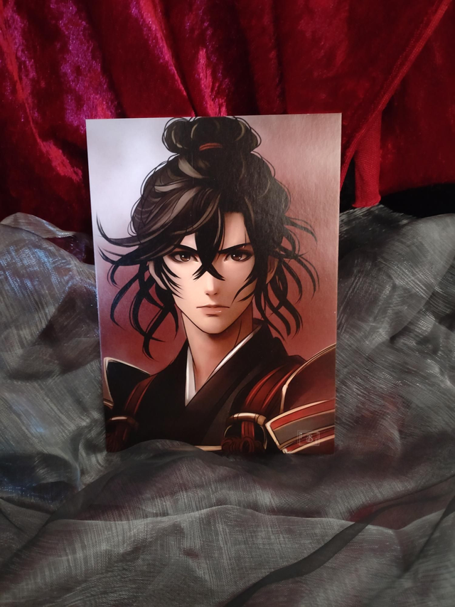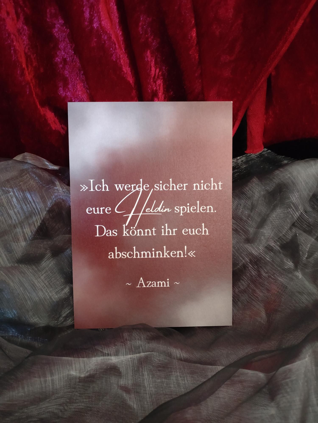 Eine illustrierte Charakterkarte aus "Azamis unzählige Leben 1: Rauchdrache". Insgesamt gibt es vier unterschiedliche Charakterkarten mit Vorder- und Rückseite: Azami, Banjaki, Tabito und Ichiro.